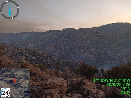 Viento de 30 km/h dificulta la lucha contra el fuego en Lubrín, Almería.